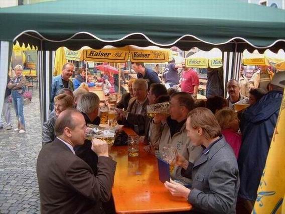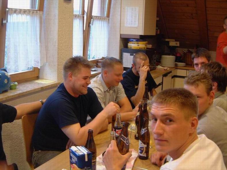 Hier sind sie gerade mit dem Bus angekommen und trinken im Vereinsheim der