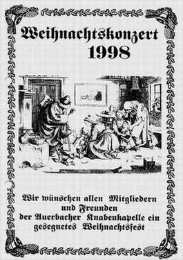 Mit ihrem Weihnachtskonzert beschloss die Knabenkapelle das Jahr 1998. 42 große und kleine Einsätze hatten die Musiker in dieser Zeit zu bestreiten. Zahlreiche Eltern und Verwandte und viele Gäste brachten durch ihre Anwesenheit und ihren Applaus die besondere Wertschätzung gegenüber den jungen Musikern zum Ausdruck. Den Auftakt des Konzertes übernahmen erstmals die 48 Jungmusiker unter der Leitung von Ludwig Riedhammer senior. Mit altbekannten Weihnachtsliedern wie „O du fröhliche“ und „Stille Nacht“ stellten die Kleinen ihr musikalisches Können unter Beweis. Den zweiten Teil des Abendprogramms gestalteten die Musiker des „großen Orchesters“ unter Leitung von Ludwig Riedhammer junior. Die musikalischen Talente ernteten für ihre fehlerlosen Darbietungen reichlich Beifall.