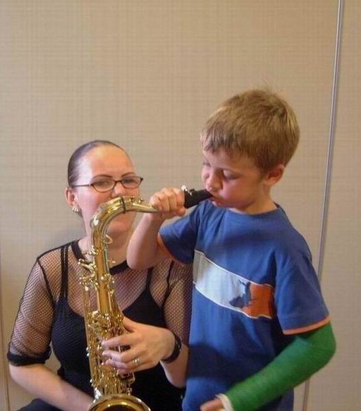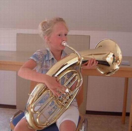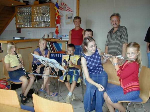 Geduldig zeigen unsere Musiker den Mädchen und Buben, wie man denn in solch ein Instrument bläst, um Töne zu entlocken.