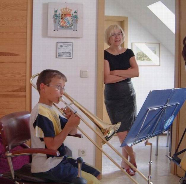 Die Leiterin des Ferienprogramms, Frau Marianne Mimler, interessiert sich für die Aktion im Vereinsheim der Knabenkapelle.