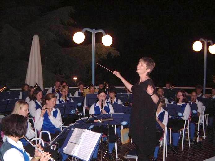Eine Lehrerin aus Pegnitz, die zufällig auch im Hotel Albatros weilt, führt den Taktstock sehr temperamentvoll beim Dirigentenwettbewerb.