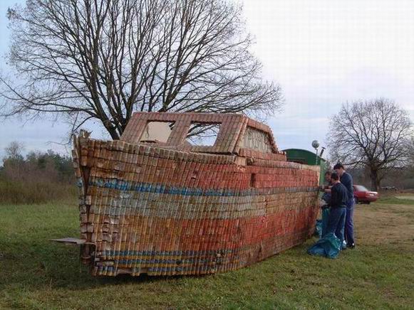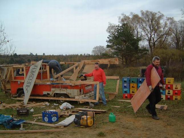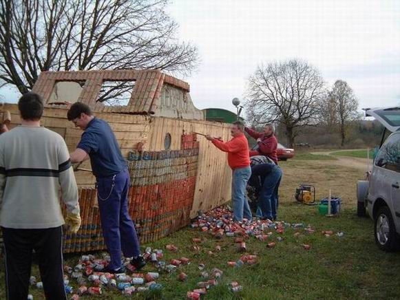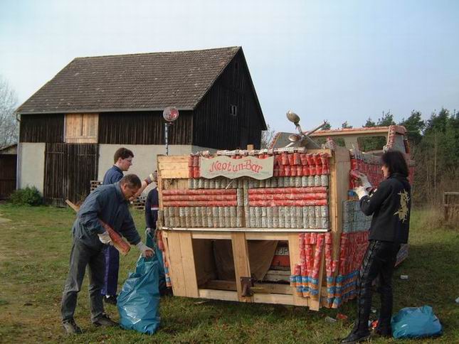 etwa 3000 Dosen als Verkleidung angeschossen.