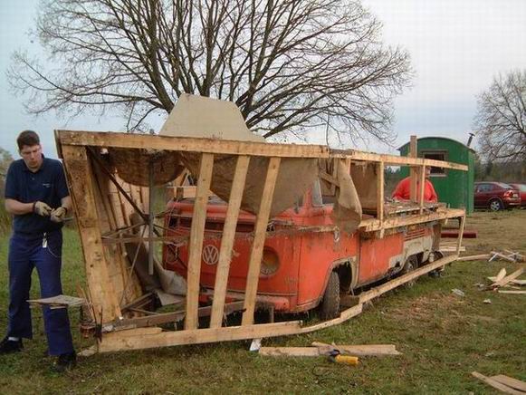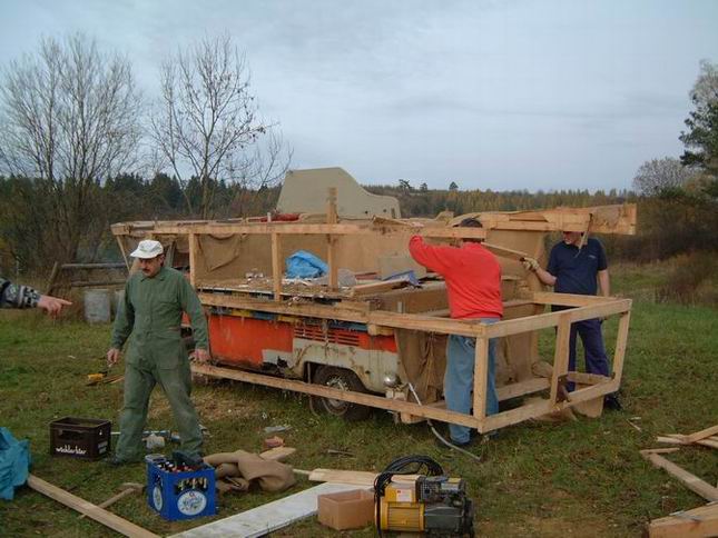 VW-Transporter, der mit Metall und Holz verkleidet wurde. Anschließend wurden