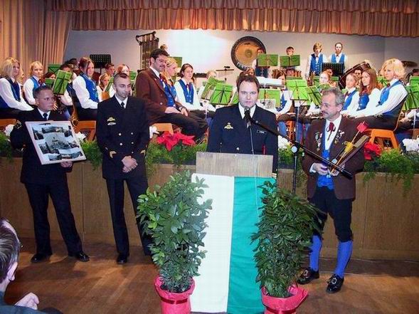 Der Kommandant unseres Patenbootes, Korvettenkapitän Marco Fröhlich, spricht Grußworte und überreicht ein Präsent an die Knabenkapelle