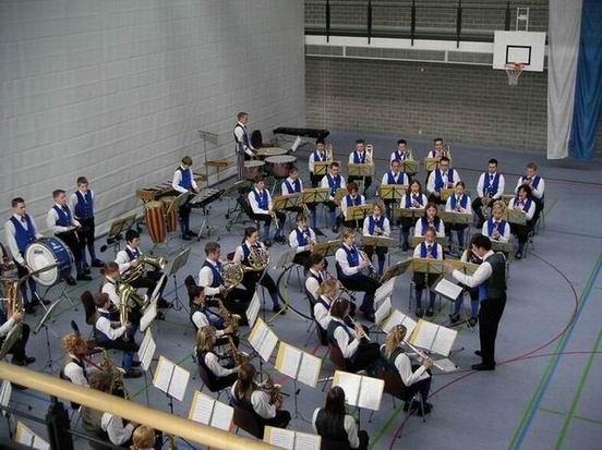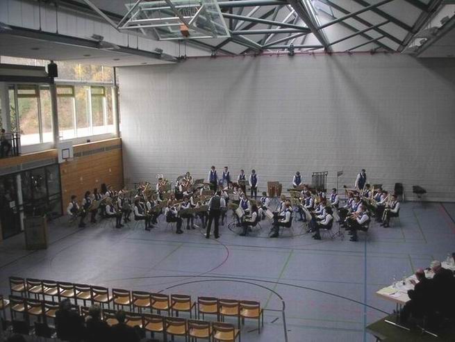 So fuhr man denn auch mit gemischten Gefühlen am Sonntag, dem 09. November gen Lappersdorf bei Regensburg. Alle waren natürlich ein wenig aufgeregt, da waren Dirigent und Vorstandschaft nicht ausgenommen. Zunächst bezogen die Musikerinnen und Musiker ein kleines Klassenzimmer einer Grundschule, um sich für den Auftritt einzuspielen. Wie die Heringe saßen und standen sie zusammengequetscht, dennoch wurden zur Intonation Tonleitern rauf und runter gespielt. Zum Schluss noch ein kurzer Soundcheck mit dem Stimmgerät, und schon drängte die Zeit. Die Schlagzeuger hatten mittlerweile ihre vielen Instrumente in Position gebracht, und schon gaben die Wertungsrichter das Zeichen für den Einzug der Knabenkapelle. Die Musikerinnen und Musiker positionierten ihre Stühle, ließen sich nieder, spielten einige Takte zur Einstimmung, erhoben und verneigten sich und waren nun bereit.